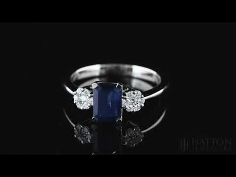 This 1.50ct deep blue sapphire stone is a true representation of pure beauty, presented between 14 perfectly round diamonds and mounted on an elegant, highly polished 9ct white gold band, this piece looks simply stunning on the hand. The floral shape of the diamond cluster adds a unique twist to the ring to make it something incredibly special. Measuring at 7.3mm across the top, this ring makes a remarkable gift to mark any special occasion.
