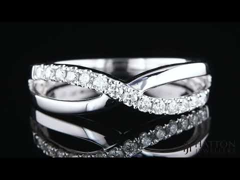 This gorgeous 18ct white gold ring has an elegant crossover/ infinity effect. A 0.20ct row of brilliant diamonds adds a touch of sparkle to the ring. The diamonds in this ring are graded at colour G/H and clarity SI.