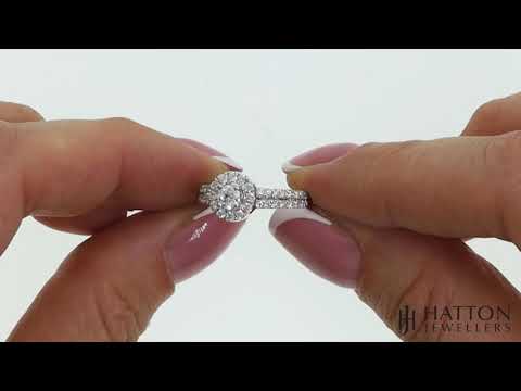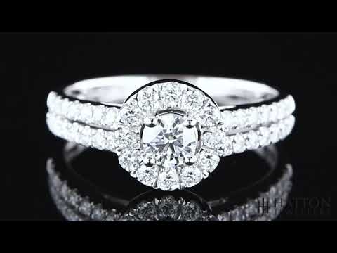 This absolutely stunning halo diamond ring is sure to make a statement, set in 18ct White gold, and boasting a carat weight of 0.75ct this beautiful piece also features a unique double band also set with diamonds. The brilliant-cut stones sparkle at GH colour & SI clarity with a prominent centre stone sure to turn heads.