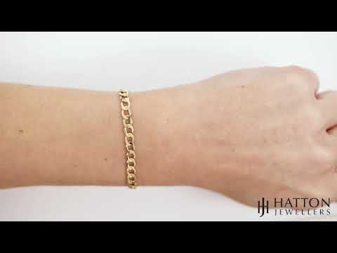 This stunning Italian-made, semi-solid beveled edge curb link bracelet is crafted from 9ct yellow gold. It is a ladies' size measuring at 7 inches in length and each link has a width of 5mm. Italian jewellery is world-renowned for being of the highest quality and this can be seen with our curb link range. Complete with a strong lobster clasp and stamped with a full British hallmark to ensure the gold purity.