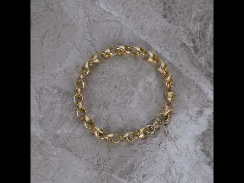 Crafted in Britain from solid 9ct yellow gold, this heavyweight bracelet features bold 8.5mm-wide patterned acorn links, each finished with intricate ornate design that strikes the perfect balance between refinement and rugged appeal. The high-polish finish amplifies its presence, making it a standout piece for daily wear or special occasions.