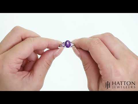 A beautiful trilogy of amethyst stones is the centerpiece of this 9ct white gold ring, with a total weight of 2.30ct, they give an incredible pop of colour. Completed with three round brilliant diamonds on each side of the shank in a grain setting and measuring at 9mm across the top, this ring is truly eye-catching.