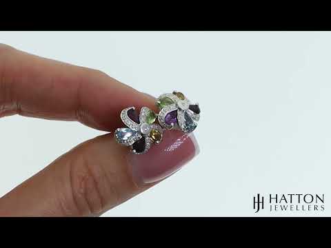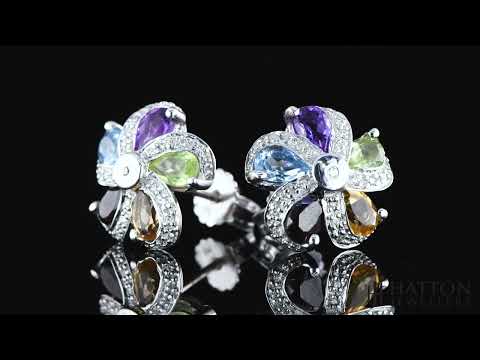 This beautifully unique pair of 9ct white gold stud earrings feature a combination of 5 natural gemstones forming the petals of a flower. The design is complemented by 0.12ct of diamonds to define each colour. This pair of stud earrings features a classic post and butterfly fastening for a secure fit.