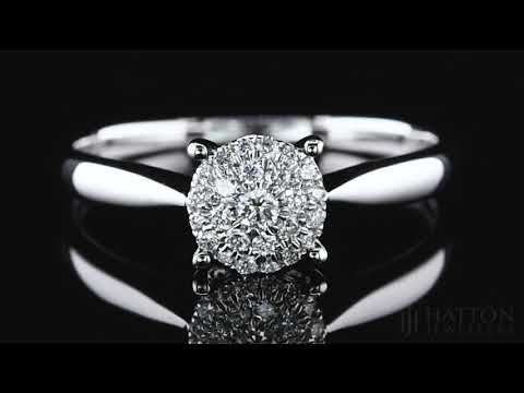 A beautiful pave set diamond solitaire style ring with a diamond carat weight of 0.15ct. The individual diamonds cause for a dazzling sparkle and the 9ct white gold band adds a stunning shine.