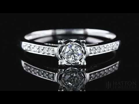 A dazzling 0.15ct diamond ring with an intricate sparkle cut effect around the centre diamond. This ring gives a beautiful glisten as it catches the light. Set in 9ct white gold to emphasize the shine of the diamonds.