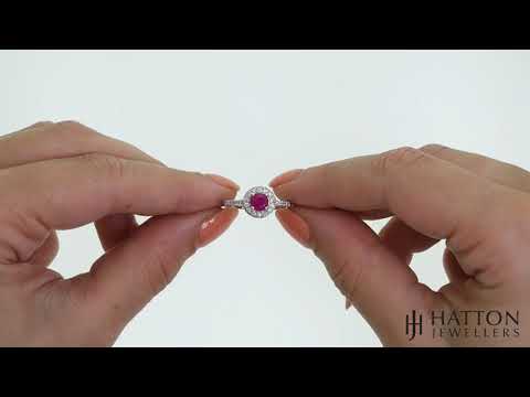This classic halo design ring is the perfect way to show her how much you love her. 0.20ct of round brilliant diamonds surround a striking 0.70ct Ruby enhancing the passionate red colour of the stone and adding a dazzling sparkle to the ring. Set on a 9ct white gold band, this ring looks simply stunning on the hand. This piece measures 8.7mm across the top.