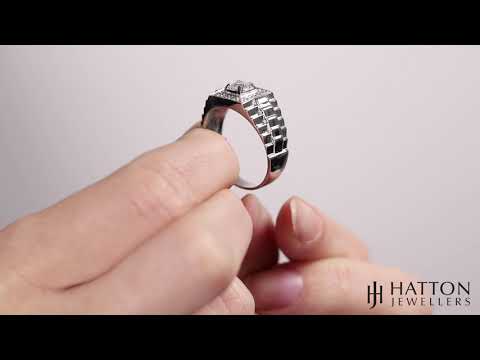 This square-shaped signet ring is crafted from solid 9ct white gold and includes a classic Rolex-style design to the shoulders. An ultra-high sparkle is created from a halo of beautiful white Cubic Zirconia gemstones surrounding one larger gemstone to the center. Finished with a highly polished ring shank and a full British Hallmark stamped on the inside of the band.