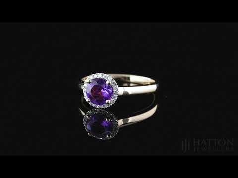 A beautiful classic design brought to life by a stunning 1.00ct Amethyst stone, this ring is set in 9ct yellow gold and features a dazzling diamond halo. Measuring at 7.9mm across the top, this ring looks simply stunning on the hand.