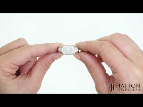 The striking square face of this 9ct yellow gold ring is studded with 0.50ct worth of eye-catching diamonds, framed by a highly polished yellow gold ridged band featuring a distinctive belt of white gold through the middle. Measuring at 11.8mm across the top, this ring is sure to make a statement.