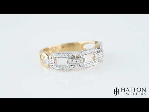 This cleverly designed 9ct yellow gold ring has a chain effect, encrusted in diamonds for an undeniable sparkle. Measuring at 5.5mm across the top, this piece makes the perfect stacking ring to elevate your style.