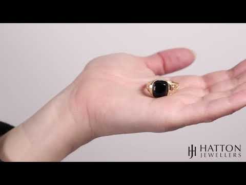 This square-shaped signet ring is crafted from solid 9ct yellow gold. One large natural Onyx gemstone is rub-over set to the center of this ring giving a simple but classic look. Finished with a highly polished ring shank and a full British Hallmark stamped on the inside of the band.