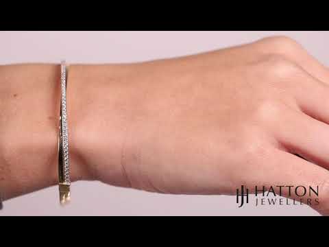 Italian made to the highest standards, this bangle is crafted from 9ct yellow gold. A classic crossover design with one-half grain set with triple-A grade cubic zirconia gemstones giving an irresistible sparkle. A push down hidden clasp is used along with a figure of eight safety clasp for added security. Finished with a high shine polish and of course, like all our items, a full British hallmark can be located inside the item guaranteeing the advertised gold purity.