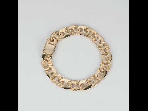 Sophisticated and bold, this ornately patterned mariner bracelet is crafted from solid 9ct yellow gold. Designed with alternating polished and ornate links, it combines striking texture with a high-shine finish, creating a bracelet that stands out for its craftsmanship and luxury appeal.