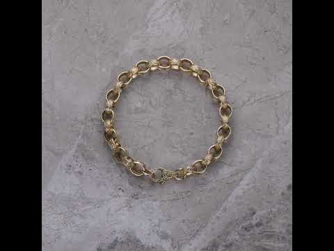 Expertly crafted from solid 9ct yellow gold, this 9mm-wide, 4mm-thick oval Belcher bracelet showcases fully engraved ornate floral patterns on each link, creating a uniquely refined and elegant design. Made in Britain with a polished finish and a secure matching clasp, it offers lasting durability paired with timeless style.