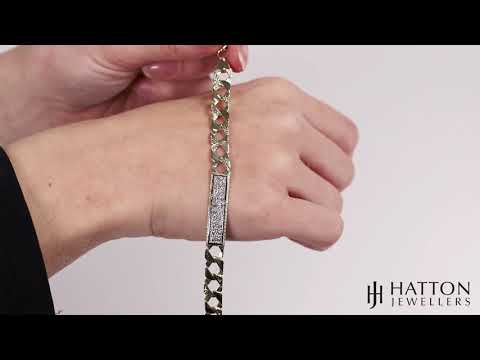 9ct yellow gold baby/childs' size traditional square solid curb bracelet. A super-strong design with a large secure clasp making this piece perfect for everyday wear. Complete with a fully CZ-set center plate for a stunning look and finish. A full British Hallmark stamp is located near the end link which guarantees the gold purity.