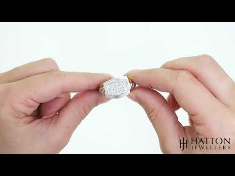 The striking square face of this 9ct yellow gold ring is studded with 24 eye-catching diamonds, framed by a highly polished yellow gold ridged band for incredible light reflection, featuring a distinctive belt of white gold through the middle. Measuring at 13.7mm across the top, this ring is sure to make a statement.