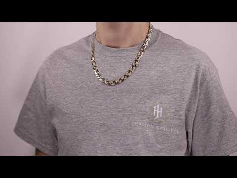 This 9ct yellow gold mariner chain is solid in structure and has a heavy strong feel when wearing. The chain features alternating polished and ornate patterned links and each link has a width of 8.5mm. The chain is complete with an extra-strong hinged clasp to ensure maximum security when wearing. A full British hallmark is located near the end of the chain to confirm the gold purity.