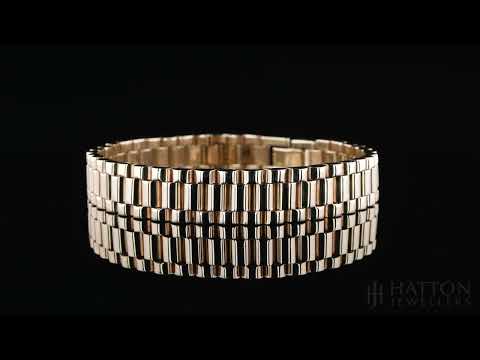 This presidential-style bracelet is crafted from 9ct yellow gold. An 11.5mm width this item features perfectly aligned solid links. The bracelet is secured with a strong hinged clasp that when the bracelet is done up the clasp is almost invisible. A full UK Hallmark is located at the back of the clasp, ensuring this is a genuine gold piece. This will fit a lady's wrist up to 6.75 inches.