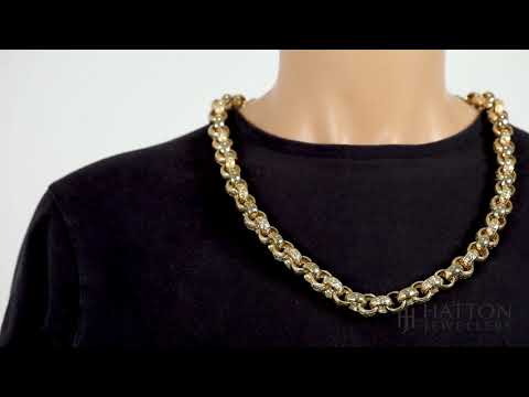 This round belcher chain is crafted from 9ct yellow gold. Each link has a diameter of 15 mm and a depth of 7mm. This stunning piece features solid perfectly aligned alternating polished and patterned links throughout. A quality made piece that is perfect for everyday wear. Stamped with a full British hallmark to ensure the gold purity.